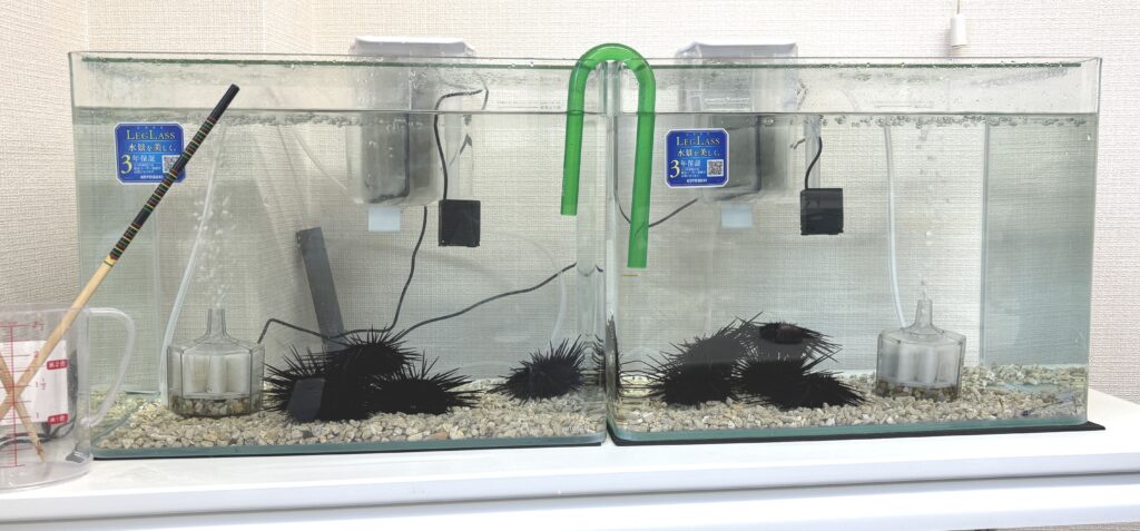同じ環境の2つの水槽で、それぞれ5匹程度のムラサキウニを飼育。